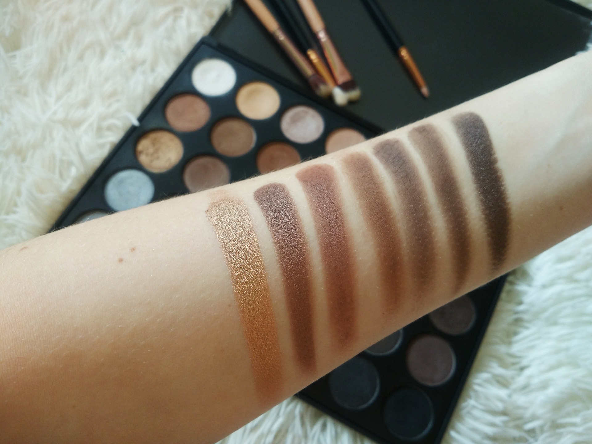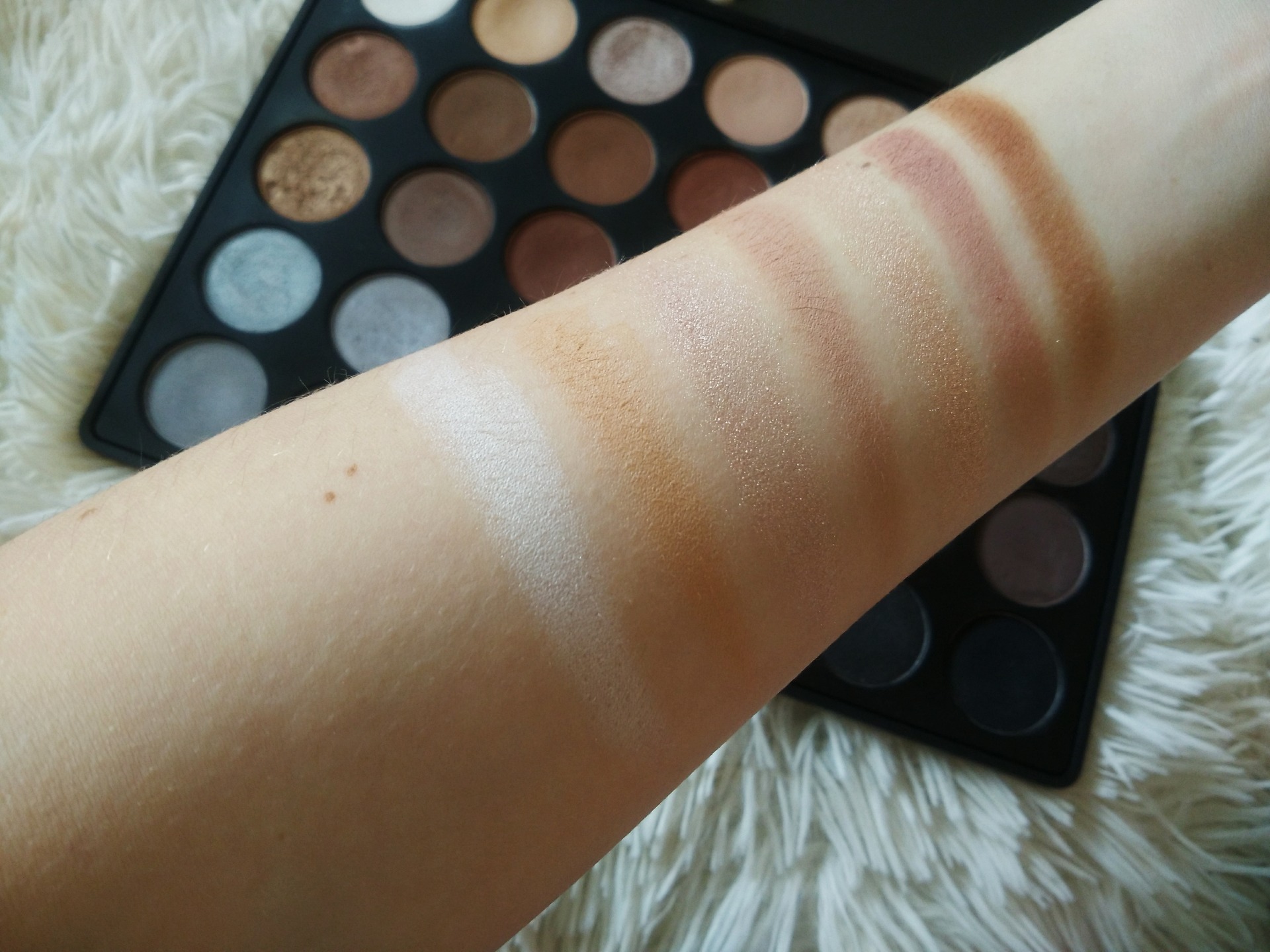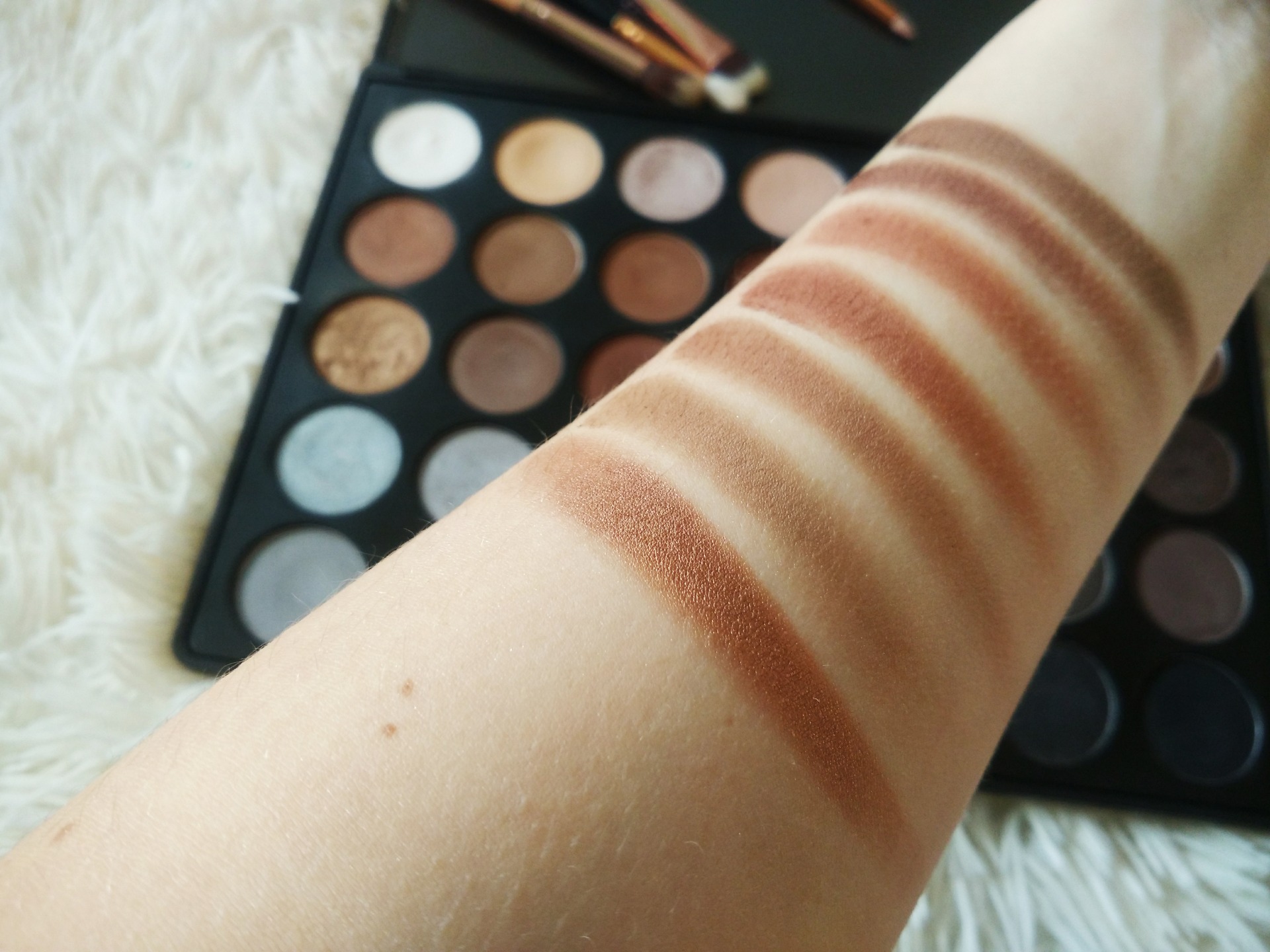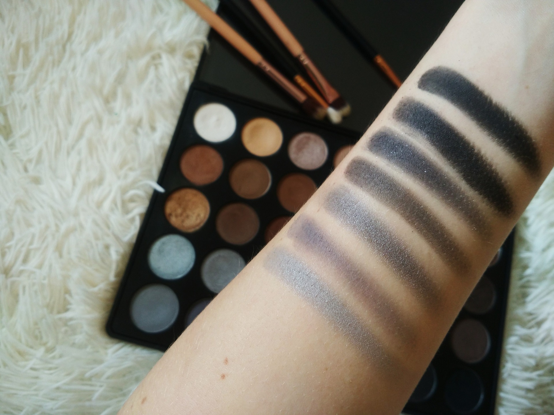 Pigmentácia tieňov je celkom slušná, no niektoré sú menej pigmentované, ale to býva vo väčšine paletiek. Vrstvenie je kameň úrazu tejto paletky, ale dá sa jej to odpustiť, pretože metalické tiene sú tak krásne. Ľahko sa s nimi pracuje, majú maslovú konzistenciu, neprášia a na viečku vydržia naozaj dlho. Matné tiene sú na tom o kúsok horšie. Aj keď sa mi ich pigmentácia páči, nie je to úplne ono. Blenduje sa mi s nimi trošku ťažšie, ako som očakávala. Aj prášivosť je podstatne väčšia, hlavne, čo sa týka tmavších tieňov. No a nakoniec sú klasické shimmerové tiene, ktoré sú z celej paletky najhoršie, pretože neuveriteľne prášia a zle držia na štetci, takže preferujem nanášanie prstom.
